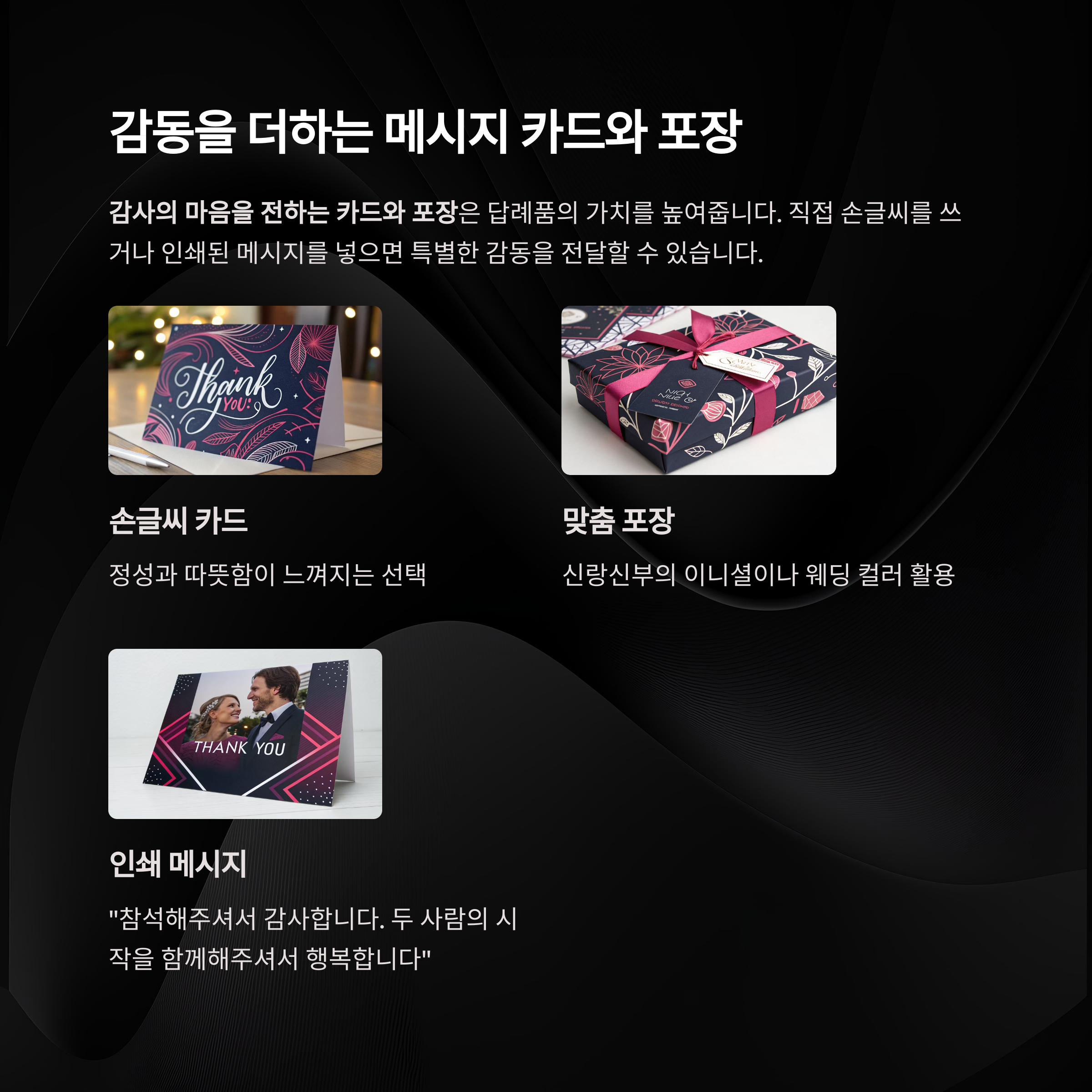답례품만큼이나 중요한 것이 바로 감사의 마음을 전하는 카드와 포장입니다.