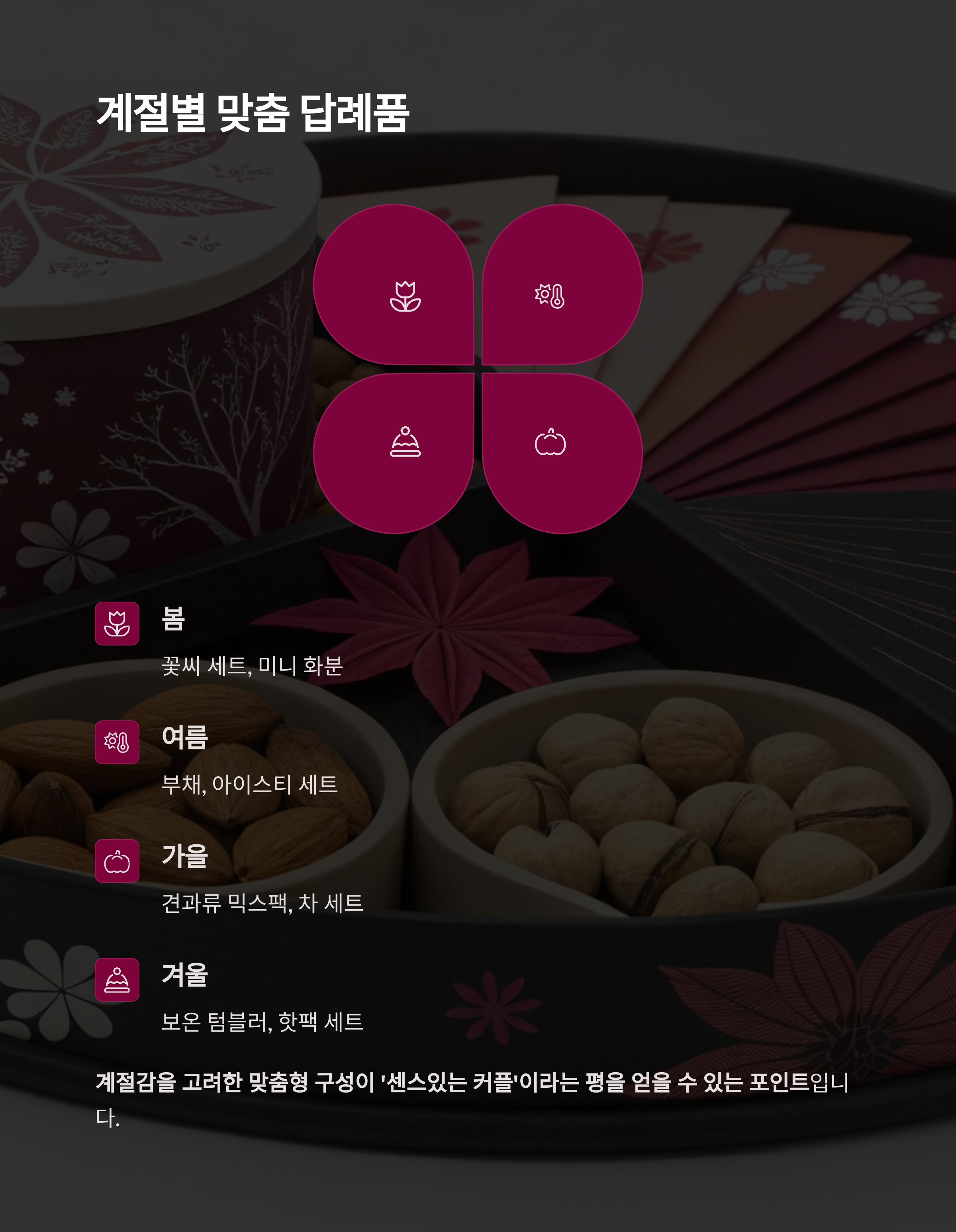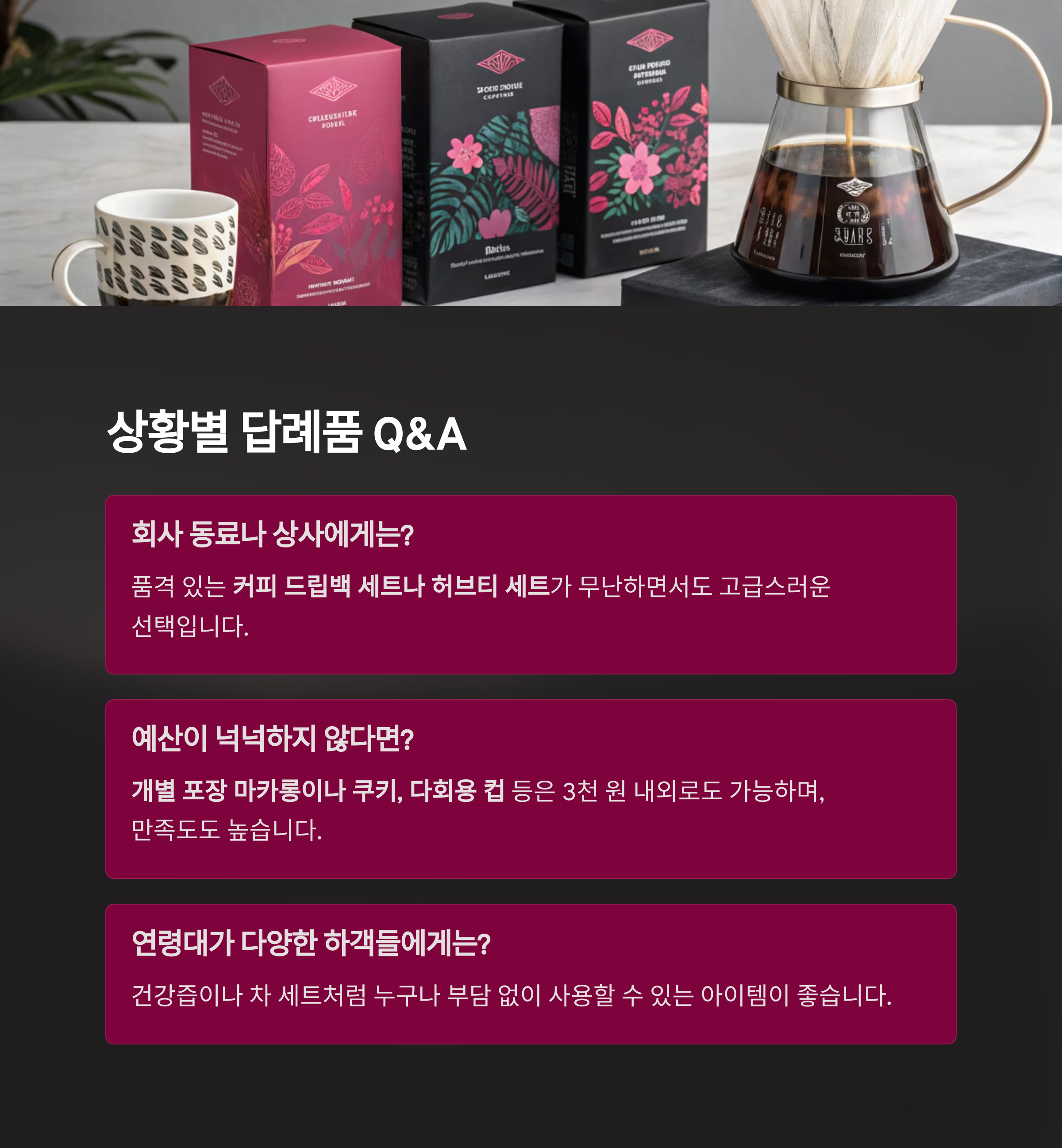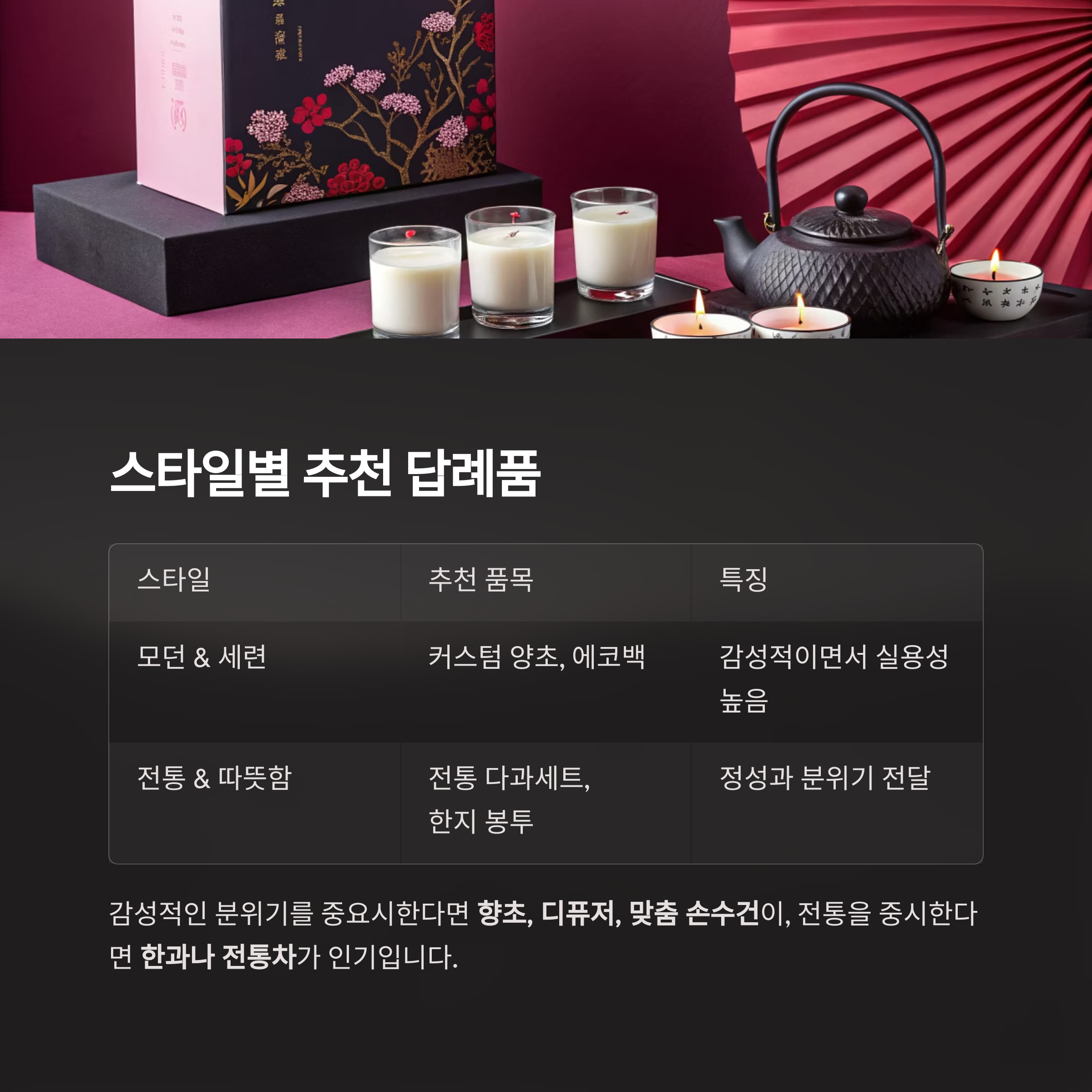 | 전통 & 따뜻함 | 전통 다과세트, 한지 봉투 | 정성과 분위기 전달 |