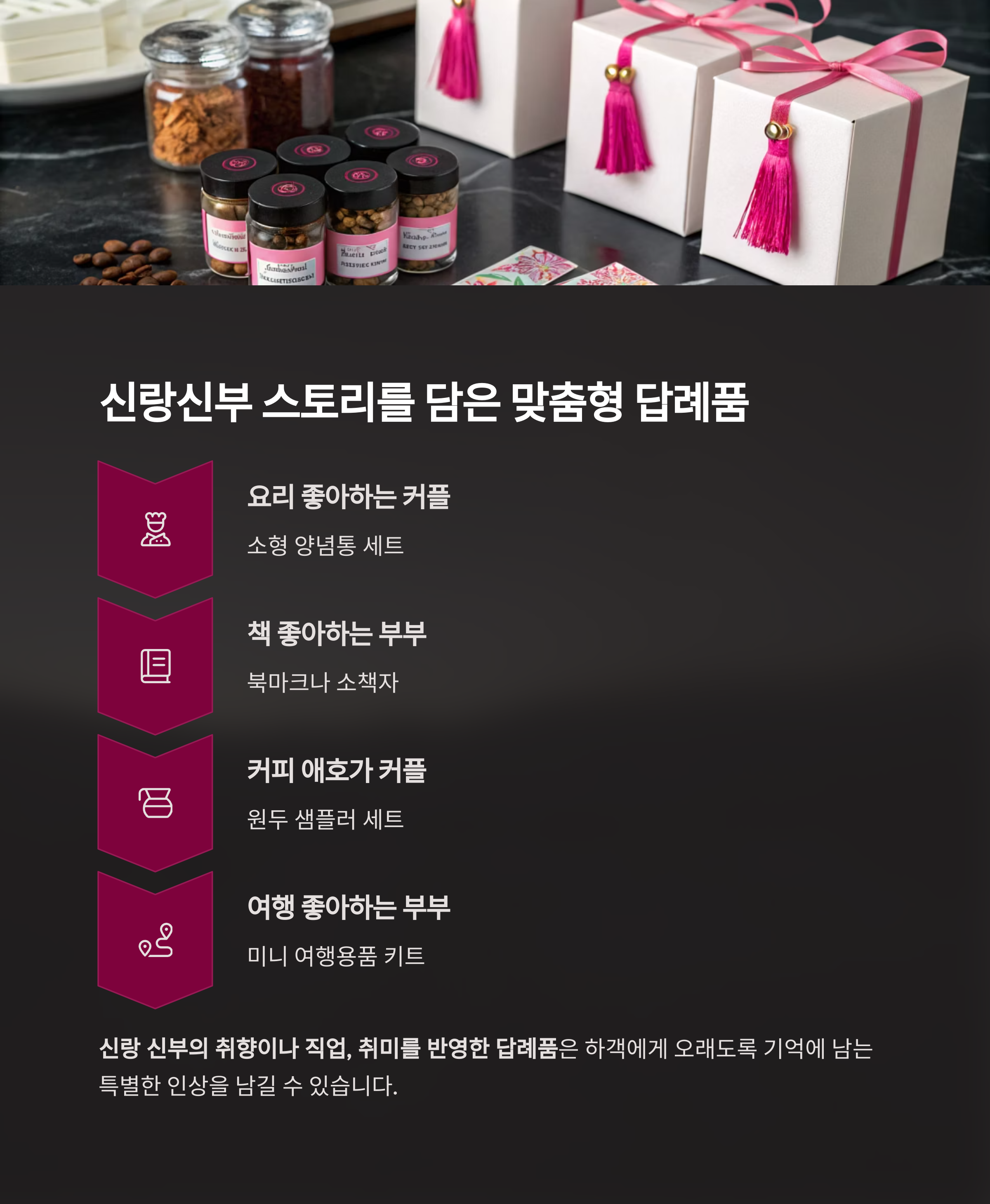 예: 요리를 좋아하는 커플이라면 소형 양념통 세트, 책을 좋아하는 부부는 북마크나 소책자