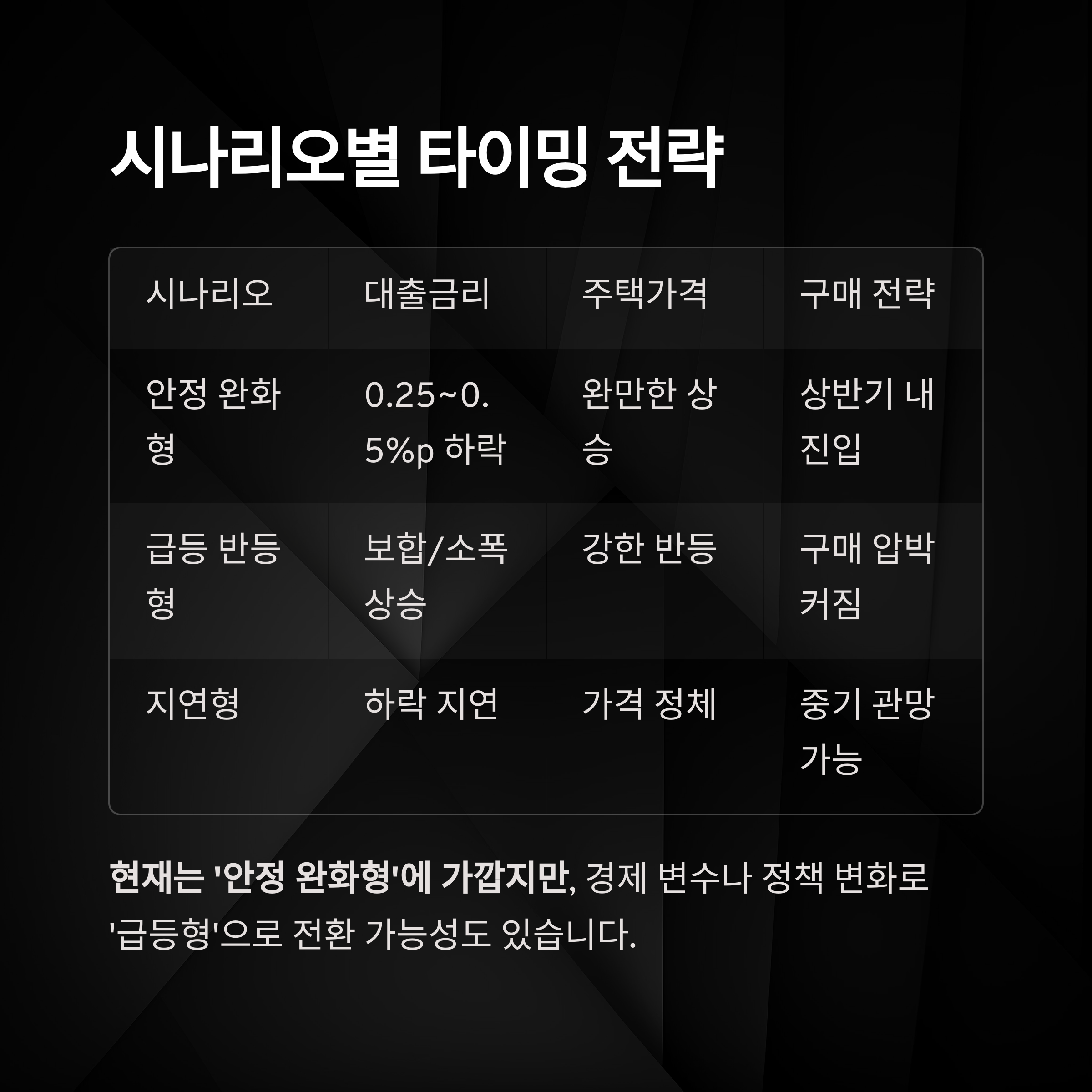 | 안정 완화형 | 0.25~0.5%p 하락 | 완만한 상승 | 상반기 내 진입 |