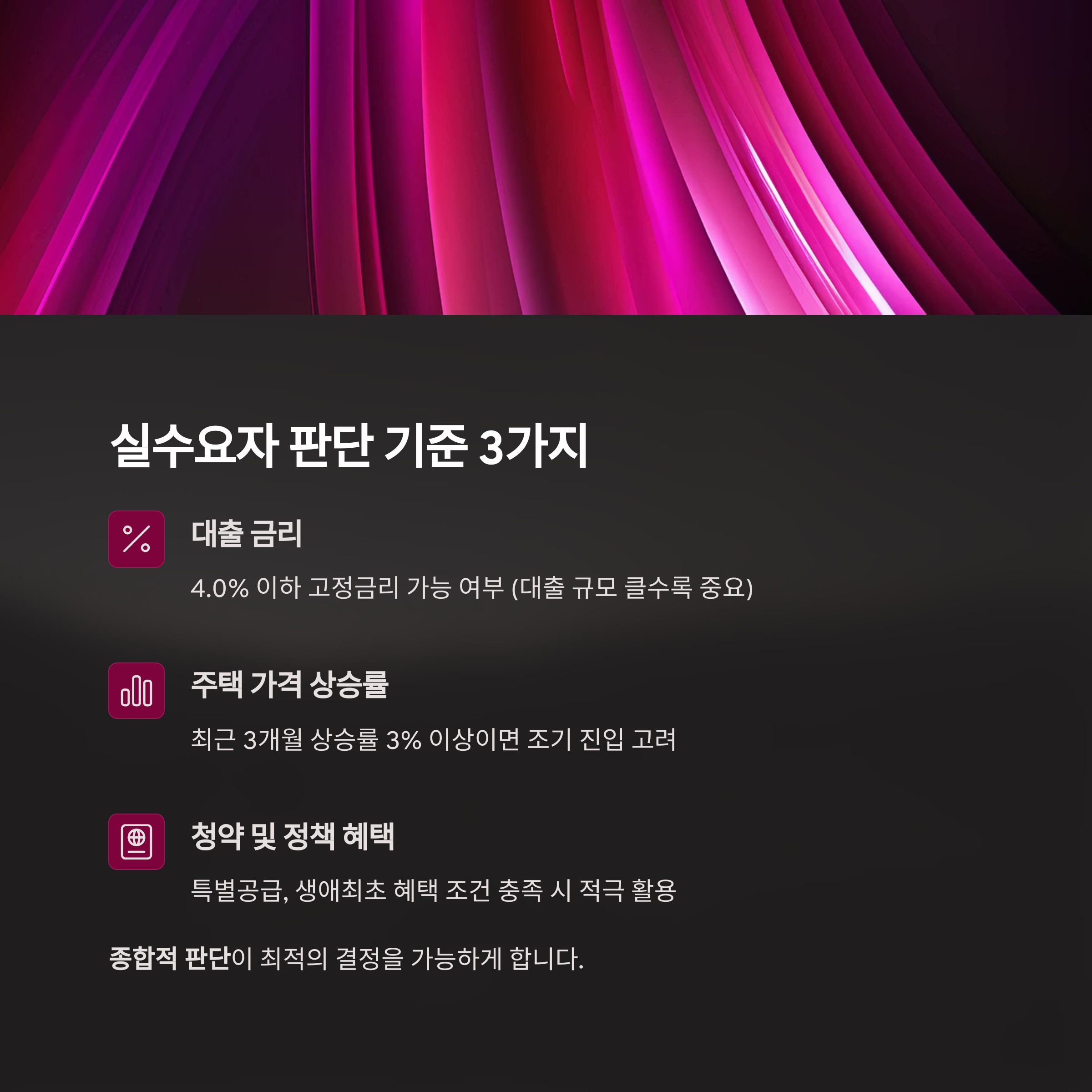 따라서 실수요자는 다음 3가지 조건을 모두 고려해 판단해야 합니다.