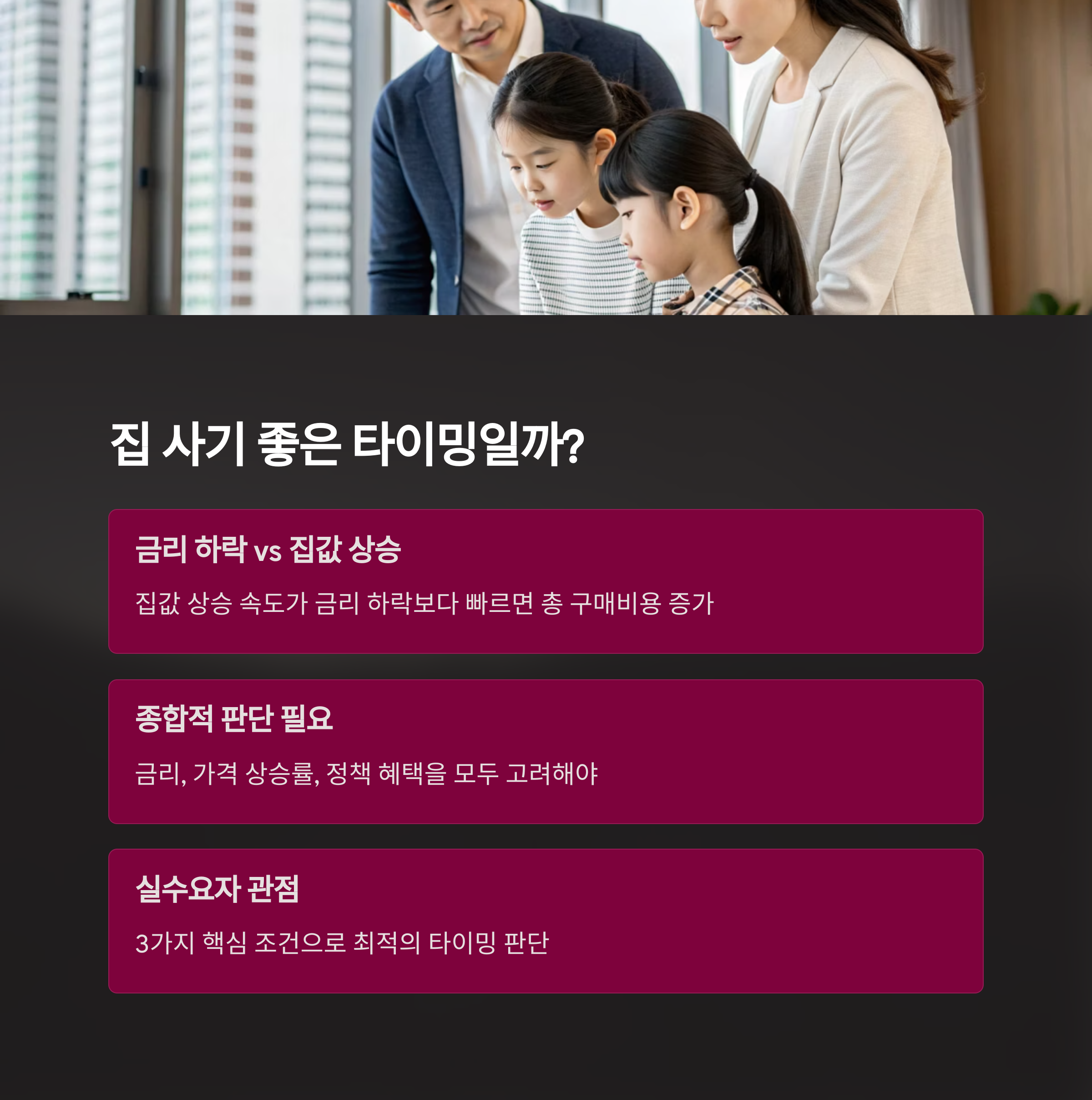 이런 국면에서는 금리 하락보다 집값 상승 속도가 빠를 경우, 대출 부담이 줄어도 총 구매비용은 증가할 수 있습니다.