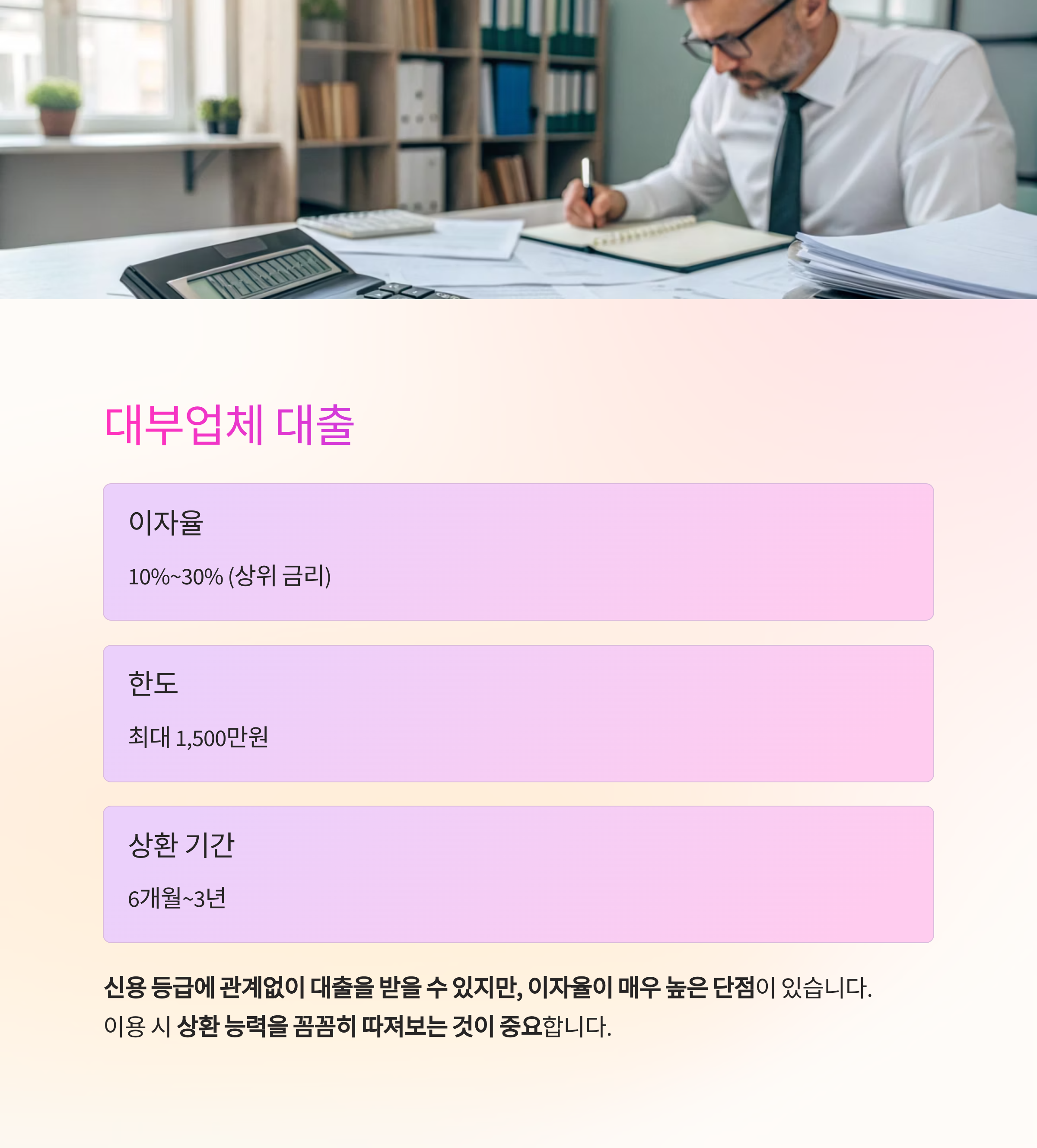 대부업체 대출은 신용 등급에 관계없이 대출을 받을 수 있지만, 이자율이 매우 높은 단점이 있습니다.