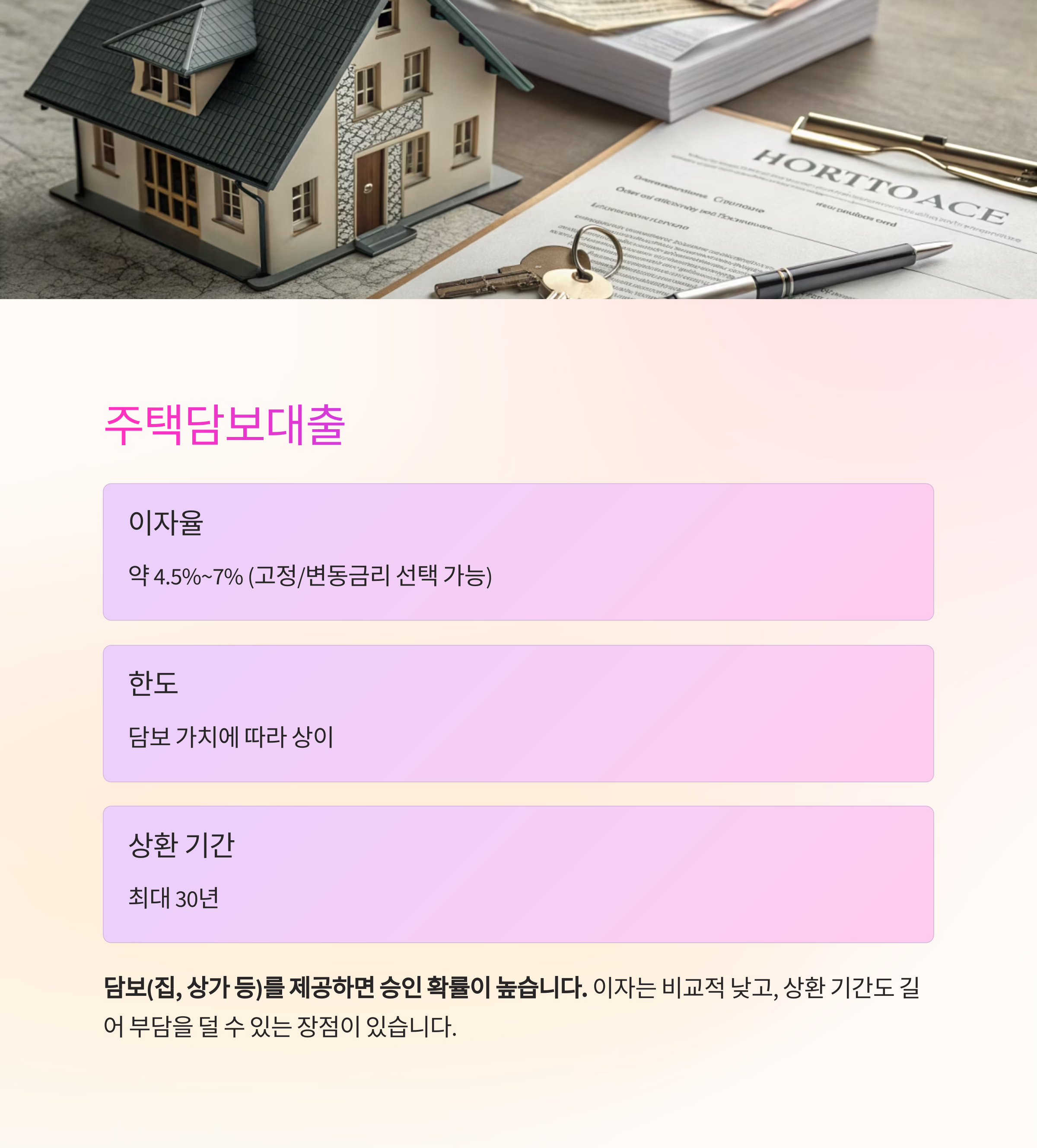 - 대출 가능성: 담보가 있는 경우, 신용 등급에 관계없이 대출 가능