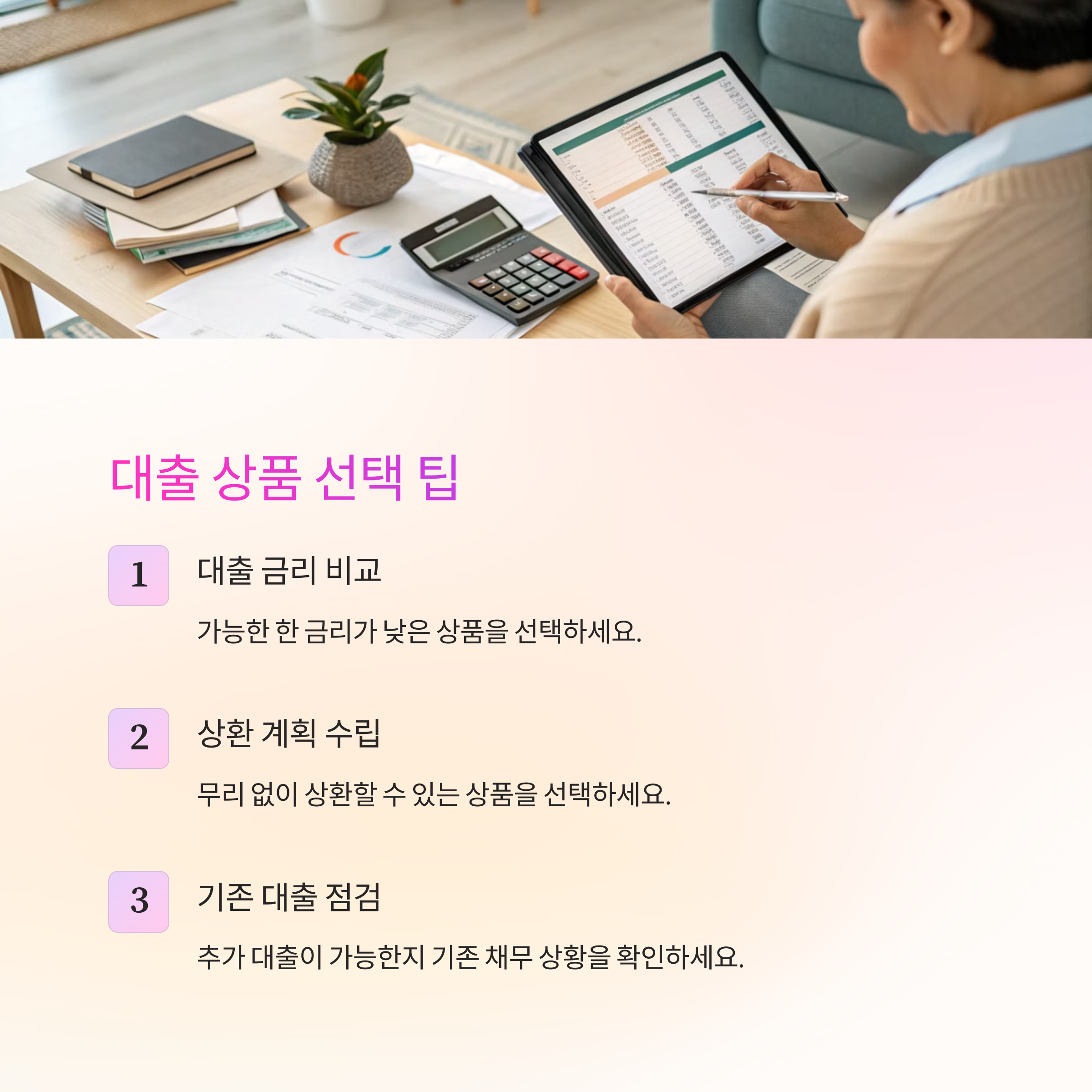 - 대출 금리는 중요한 요소이므로, 가능한 한 금리가 낮은 상품을 선택해야 합니다.