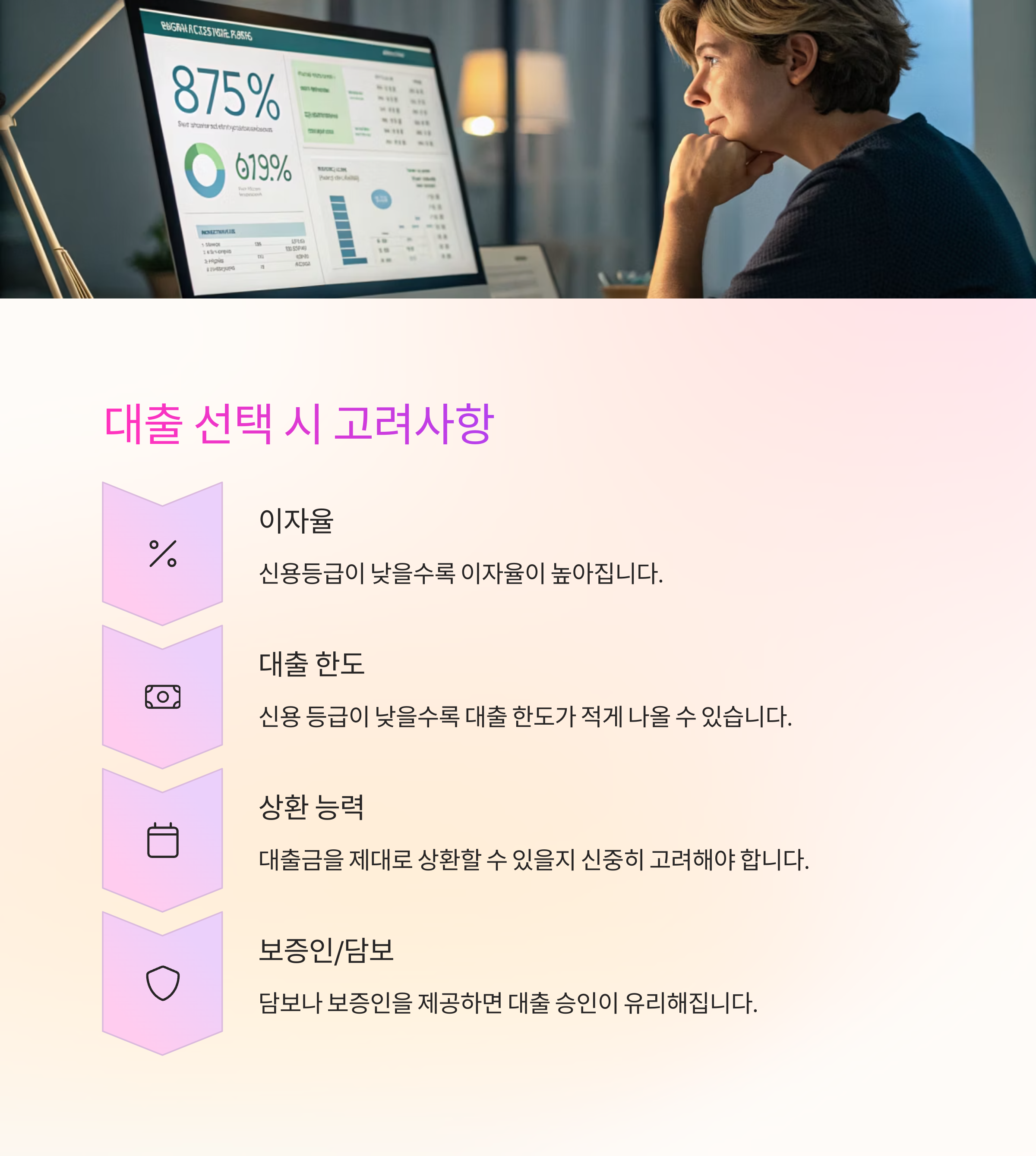- 대출 한도: 신용 등급이 낮을수록 대출 한도가 적게 나올 수 있습니다. 필요한 금액을 신중하게 판단하세요.