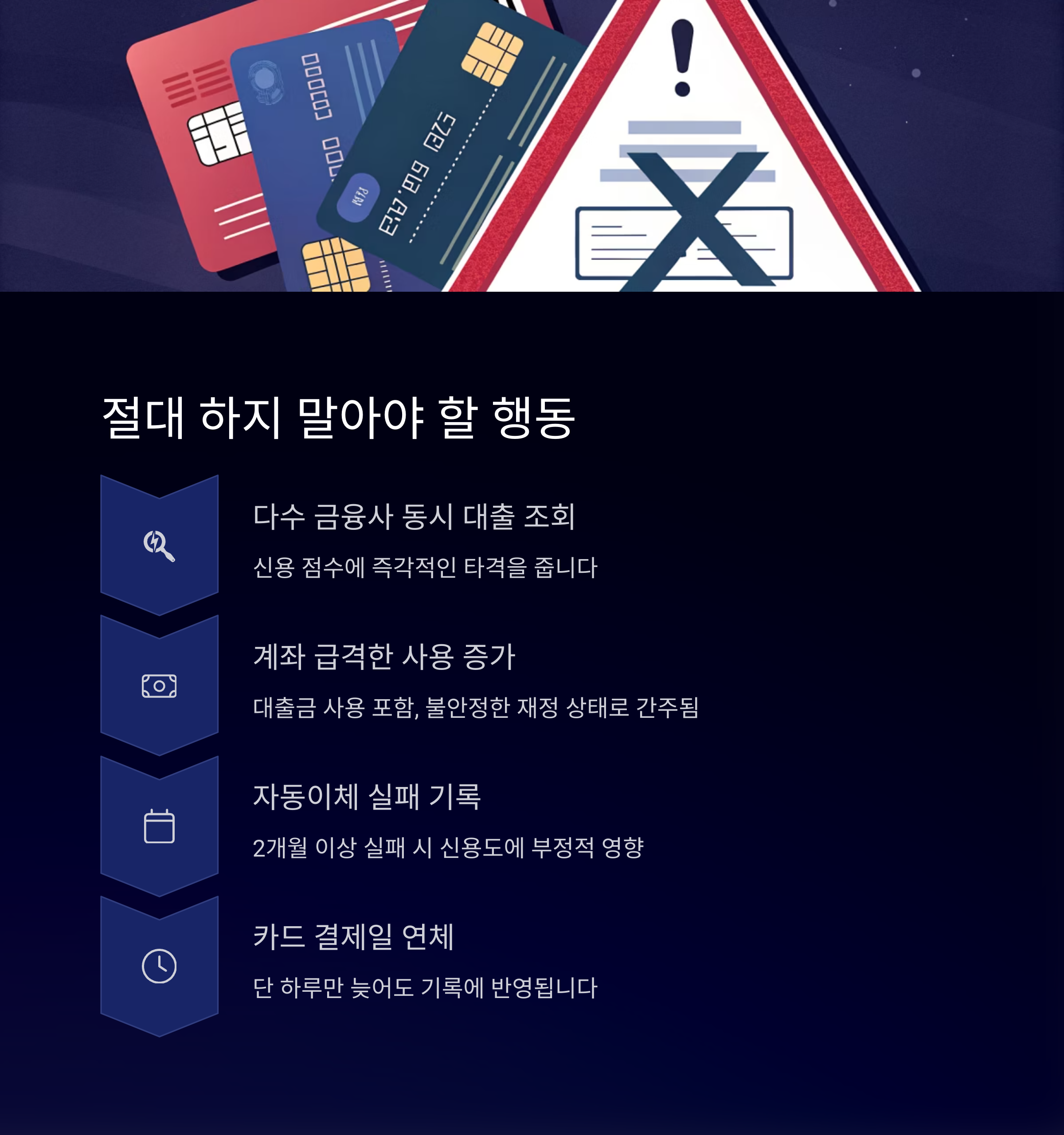 신용점수는 ‘신뢰의 데이터’이기 때문에, 지속적이고 안정적인 패턴이 가장 중요합니다.