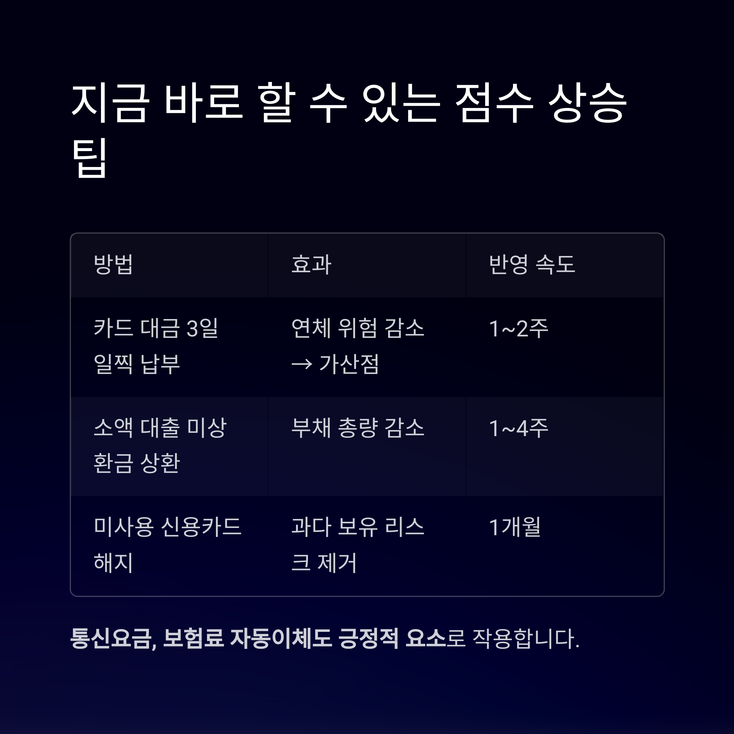 | 카드 대금 3일 일찍 납부 | 연체 위험 감소 → 가산점 발생 | 1~2주 |