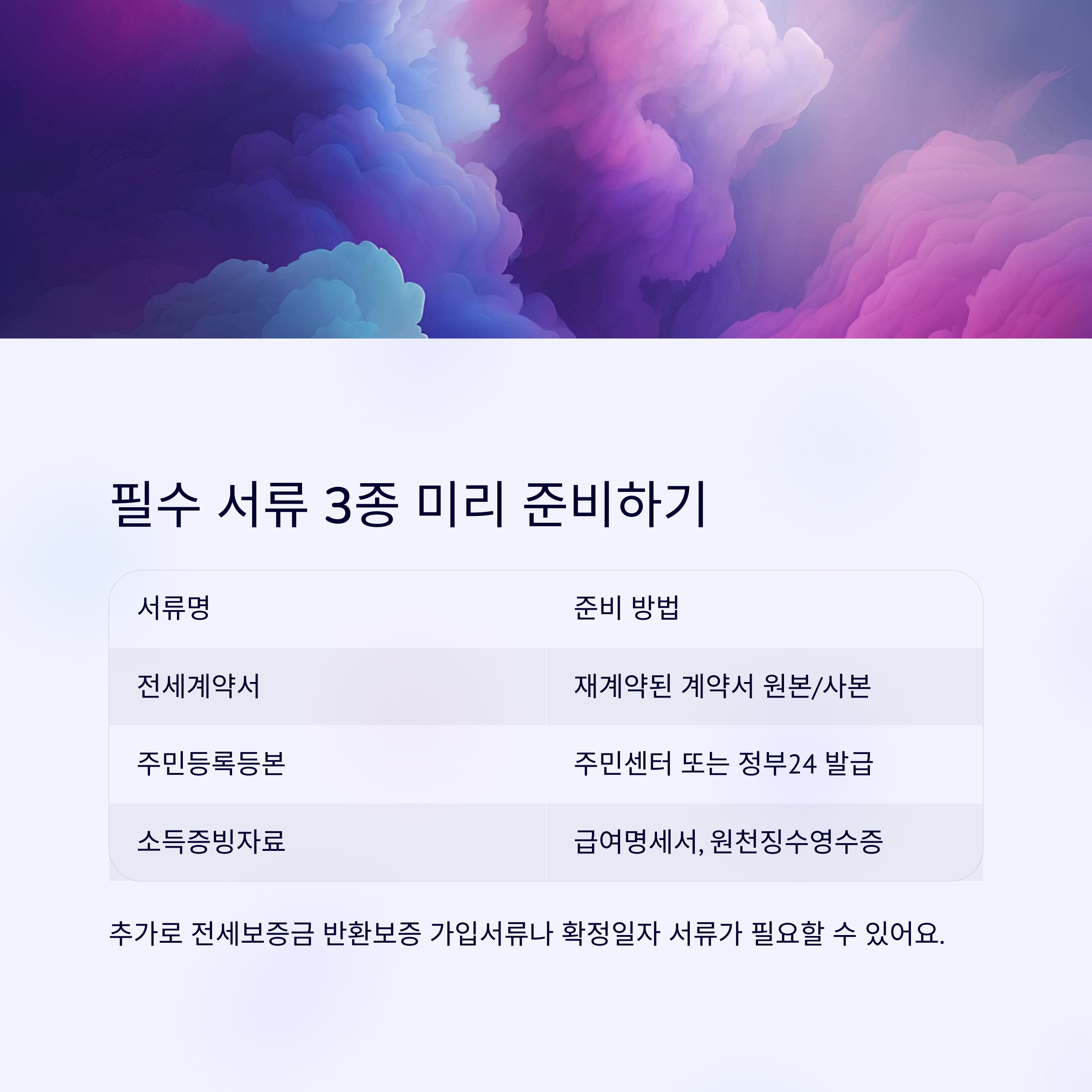 추가로 은행에 따라 전세보증금 반환보증 가입서류나 확정일자 서류를 요구할 수 있으므로 사전 문의가 필요합니다.
