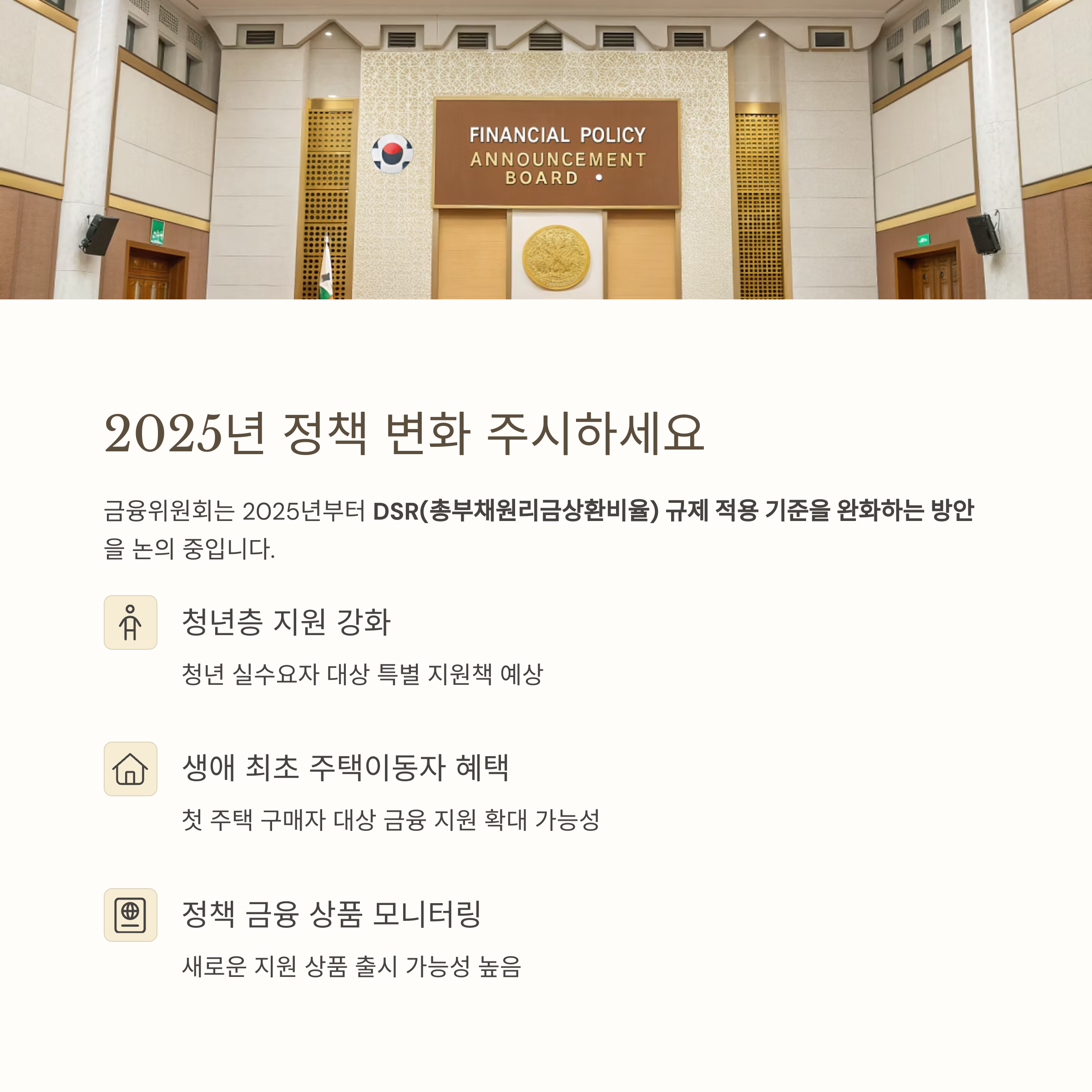금융위원회는 2025년부터 DSR(총부채원리금상환비율) 규제 적용 기준을 완화하는 방안을 일부 논의 중입니다.