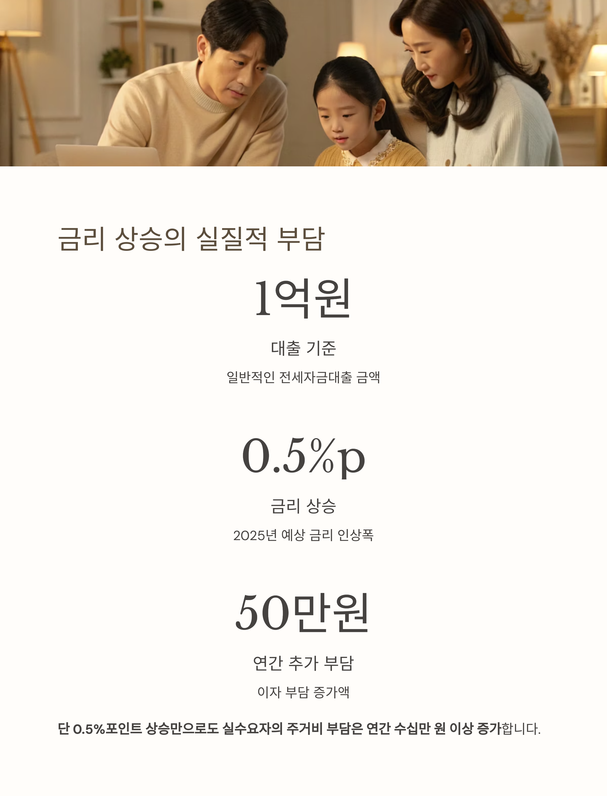 단 0.5%포인트 상승만으로도 실수요자의 주거비 부담은 연간 수십만 원 이상 증가할 수 있습니다.