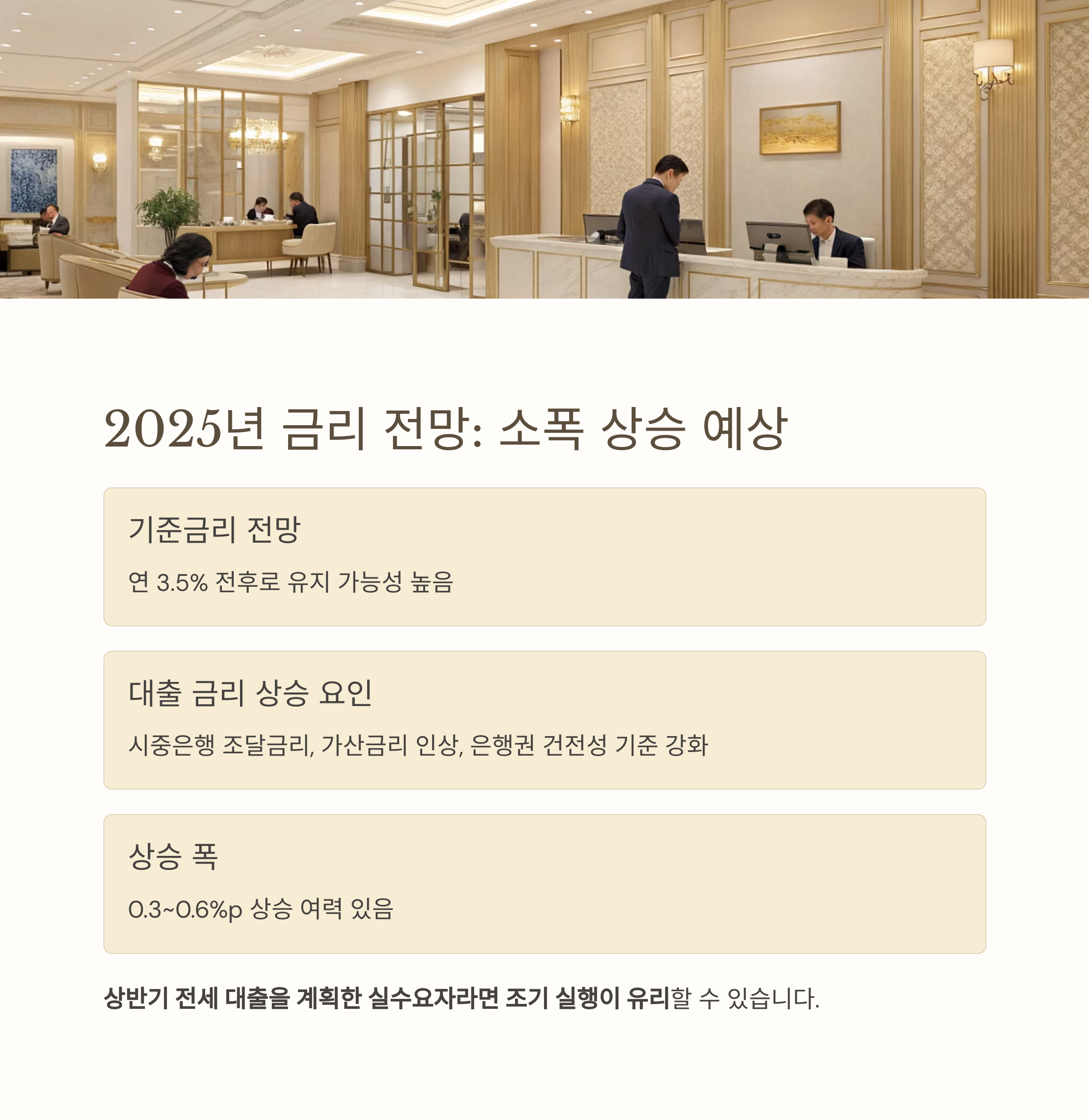 금융권 전망에 따르면 2025년 기준금리는 연 3.5% 전후로 유지될 가능성이 높지만,