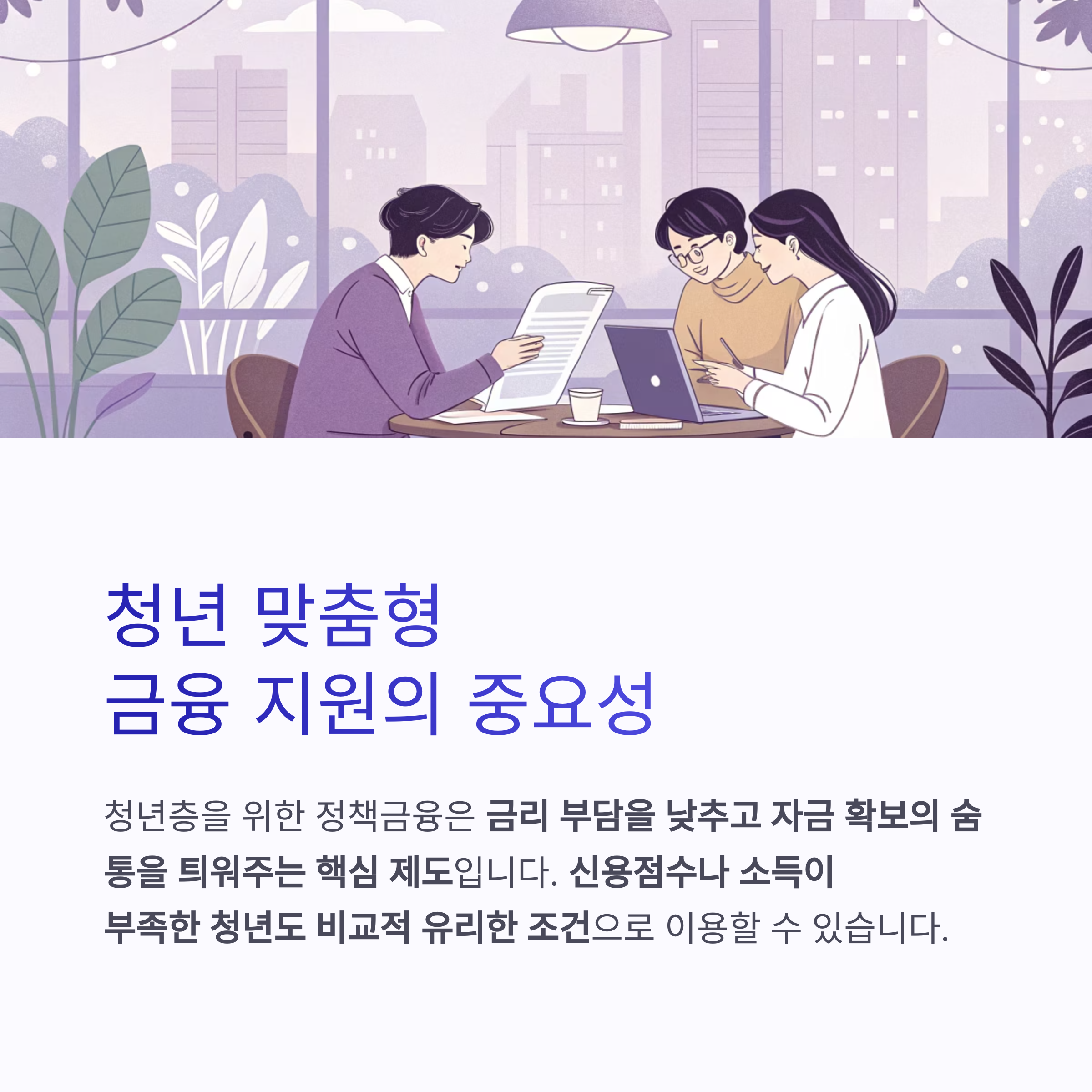 신용점수나 소득이 부족한 청년도 비교적 유리한 조건으로 접근 가능합니다.