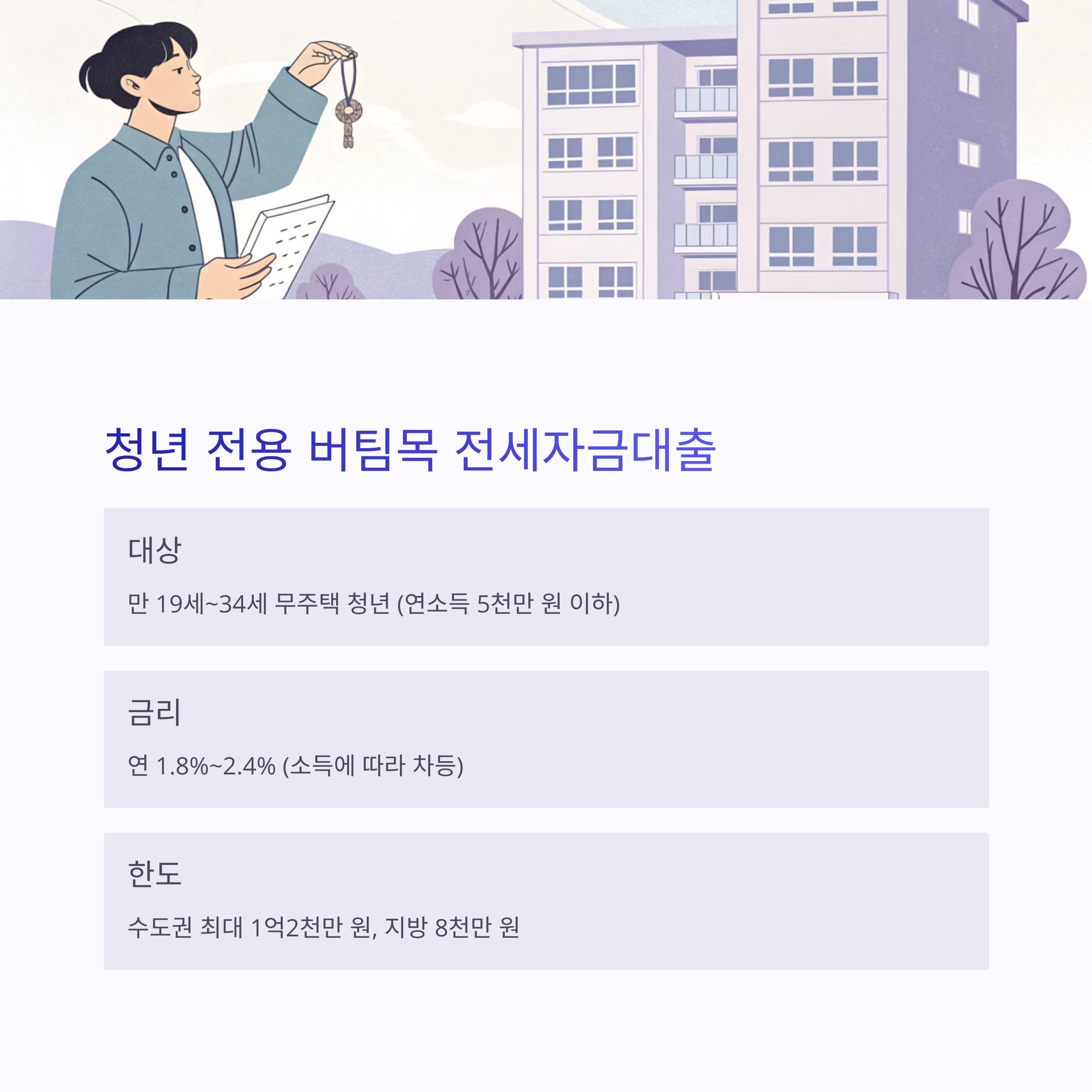 | 대상 | 만 19세~34세 무주택 청년 (연소득 5천만 원 이하) |