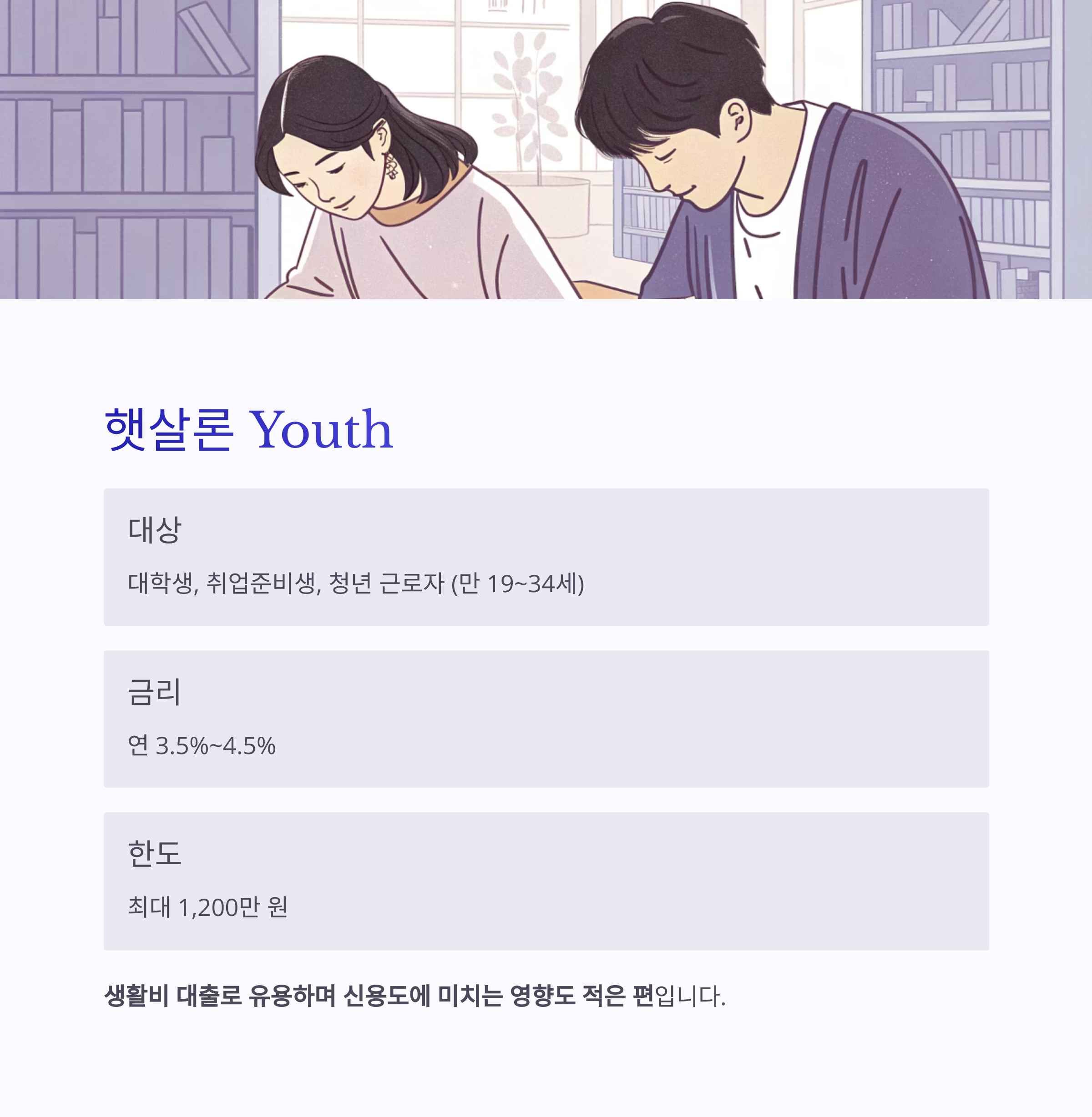 **사회초년생, 취업준비생이 자격요건을 충족할 경우, 생활비 대출로 유용하며 신용도에 미치는 영향도 적은 편입니다.