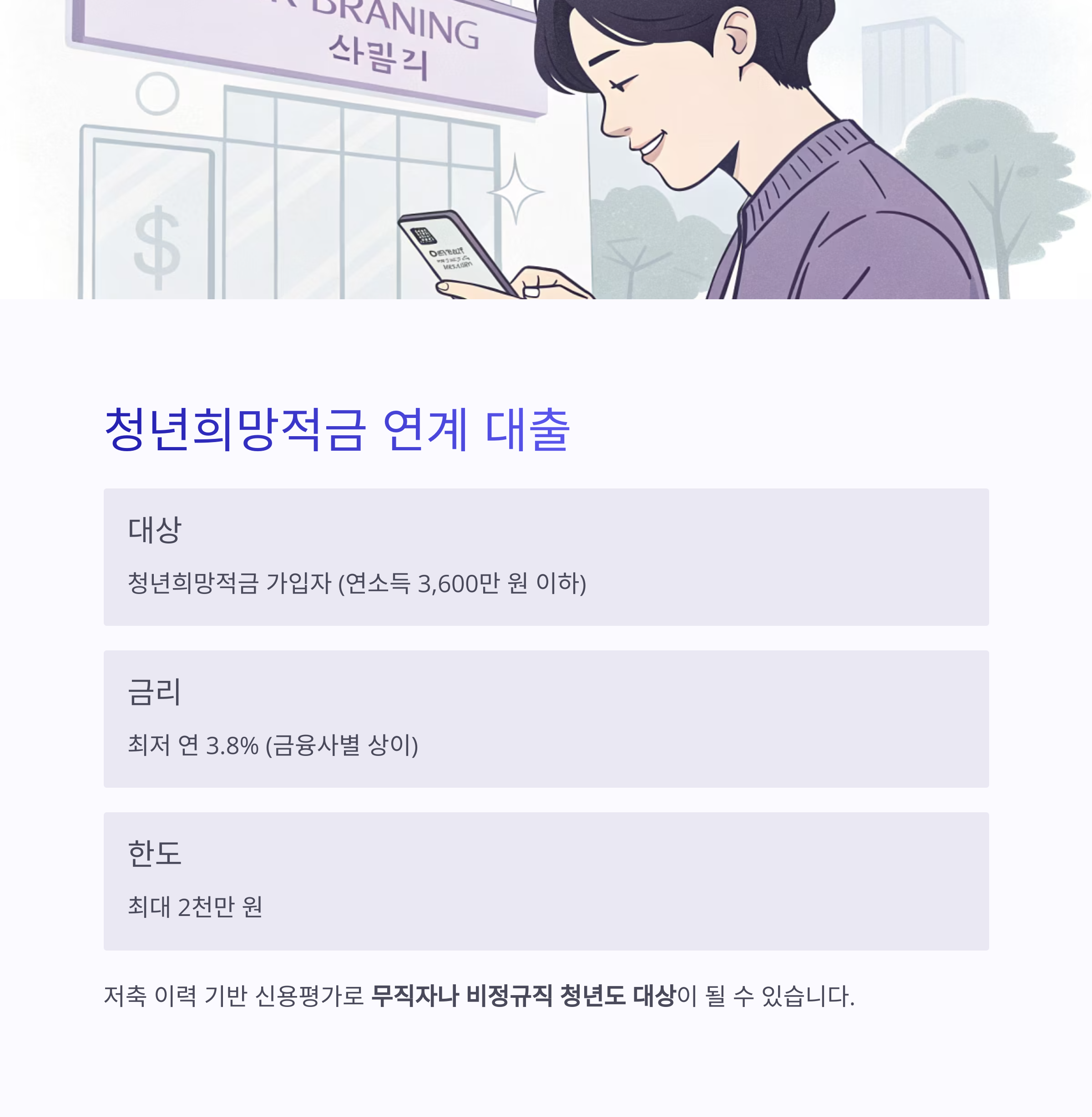 청년희망적금과 연계해 대출 금리를 낮출 수 있는 구조로, 무직자나 비정규직 청년도 대상이 될 수 있습니다.