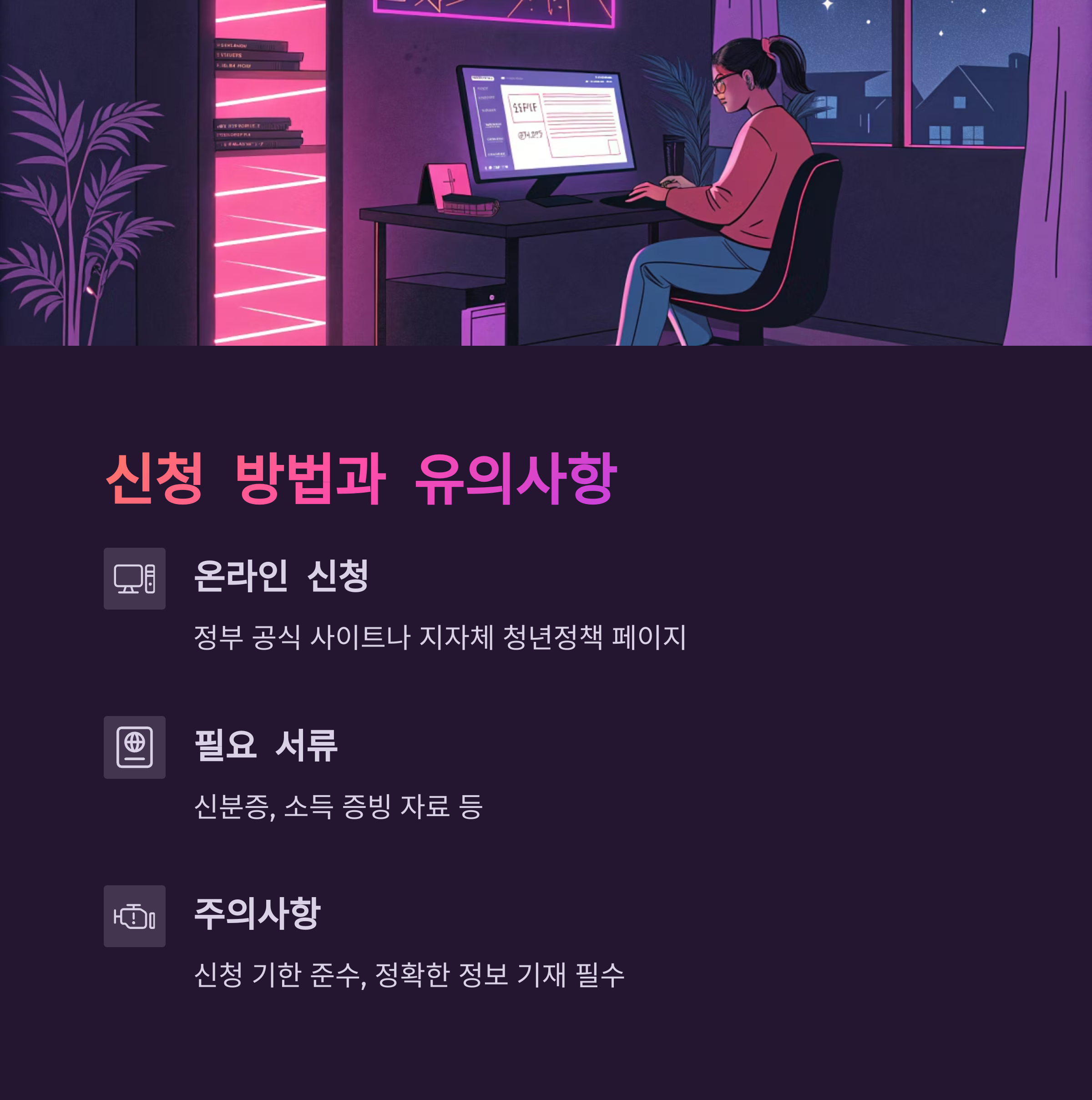 각 지원금의 신청 방법은 온라인 신청과 오프라인 신청으로 나뉘며, 신청 기간과 필요 서류가 상이할 수 있습니다. 일반적으로 정부 공식 사이트나 지자체의 청년정책 페이지를 통해 신청할 수 있으며, 신분증과 소득 증빙 자료 등이 필요할 수 있습니다. 신청 기한을 놓치지 않도록 주의하시고, 허위 신청 시에는 지원금이 환수될 수 있으므로 정확한 정보를 기재하시기 바랍니다.(팁&인사이트(Insight & Tips))