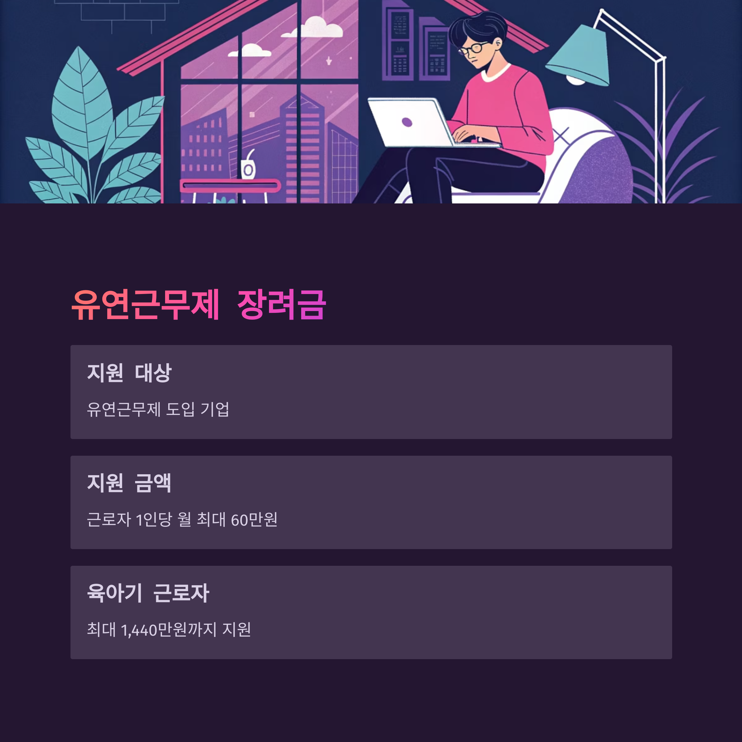청년 근로자의 일과 삶의 균형을 지원하기 위한 유연근무제 장려금도 시행되고 있습니다. 재택근무, 시차출퇴근제, 선택근무제 등을 도입한 기업에 대해 정부가 근로자 1인당 월 최대 60만 원, 연간 최대 720만 원까지 지원합니다. 특히 육아기 근로자의 경우 지원 금액이 두 배로 상향되어 최대 1,440만 원까지 받을 수 있습니다. (Workforce Management Software | Shiftee)