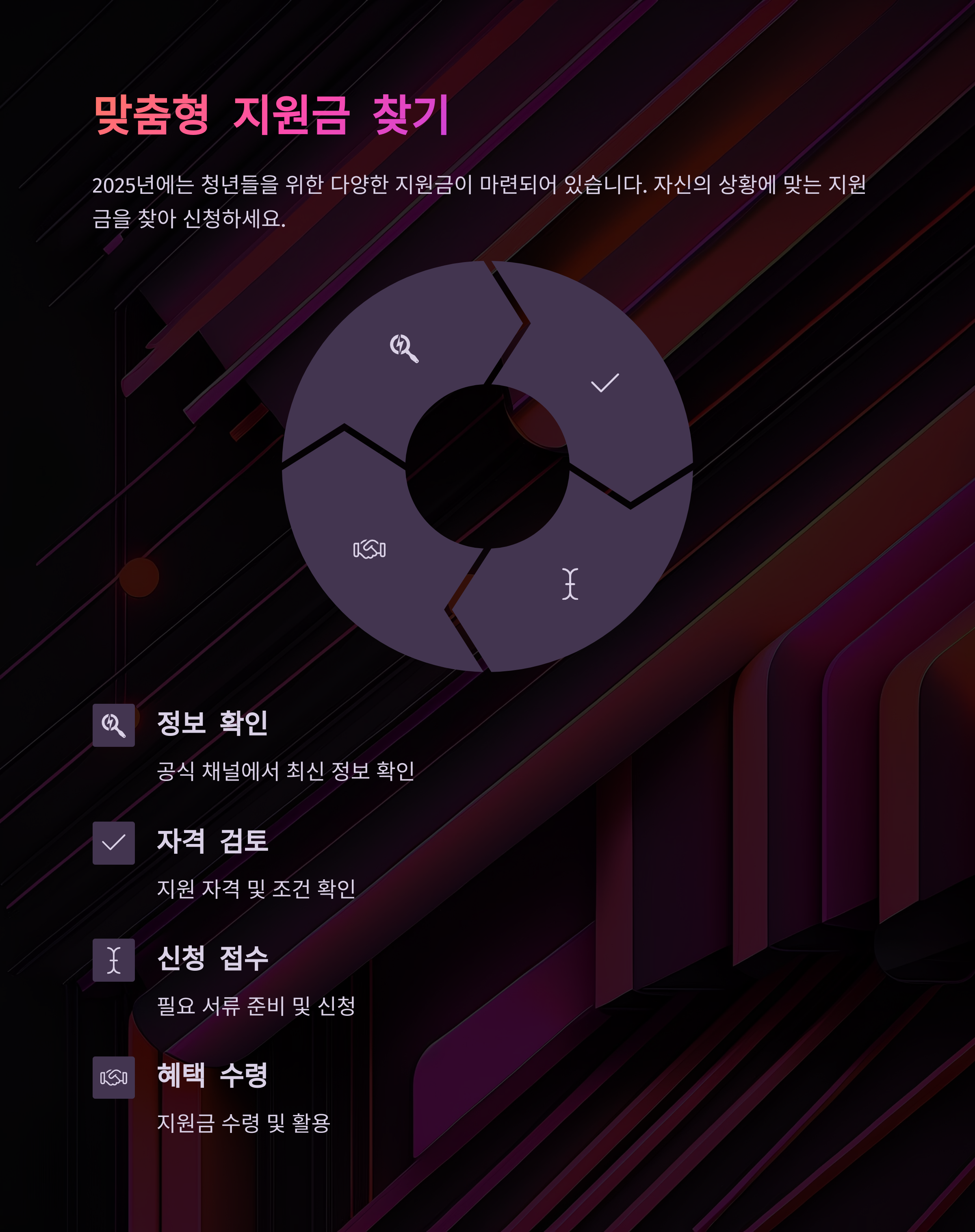 2025년에는 청년들을 위한 다양한 지원금이 마련되어 있어, 자신의 상황에 맞는 지원금을 찾아 신청하는 것이 중요합니다. 정부와 지자체의 공식 채널을 통해 최신 정보를 확인하고, 필요한 지원을 적극적으로 활용하시기 바랍니다.