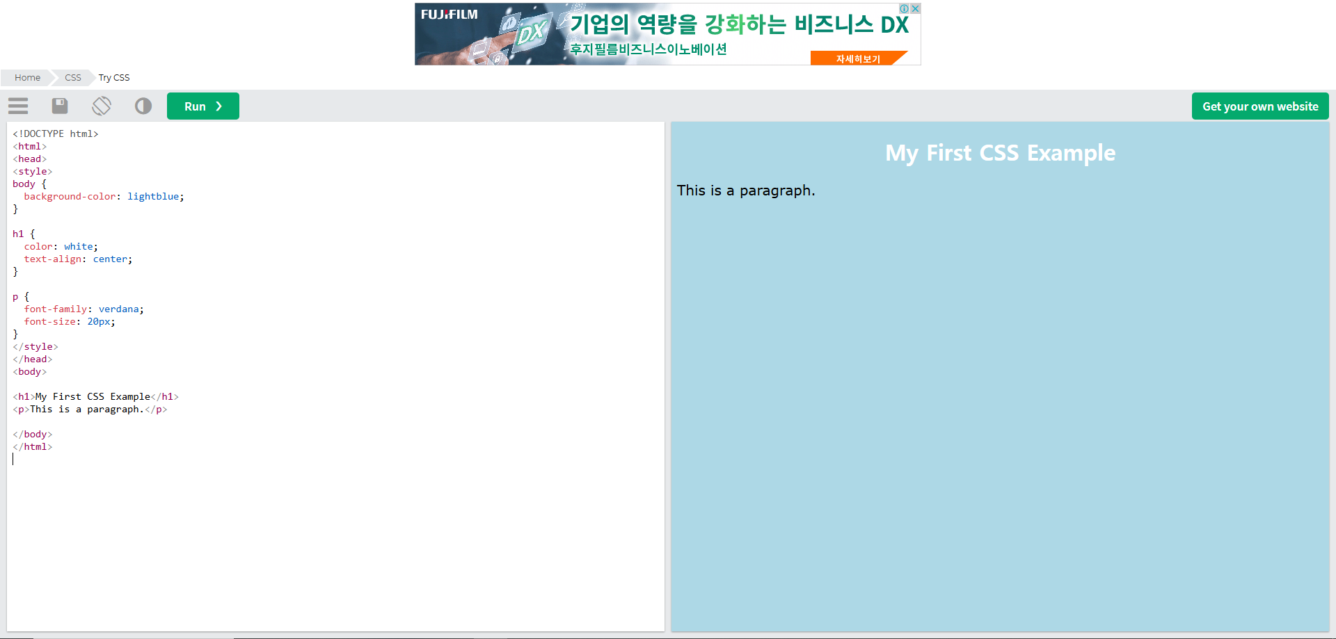 위 코드를 입력 후 실행하면, 배경색이 연한 파란색이고 중앙에 흰색 텍스트로 제목과 문장이 표시되는 웹 페이지를 확인할 수 있습니다.